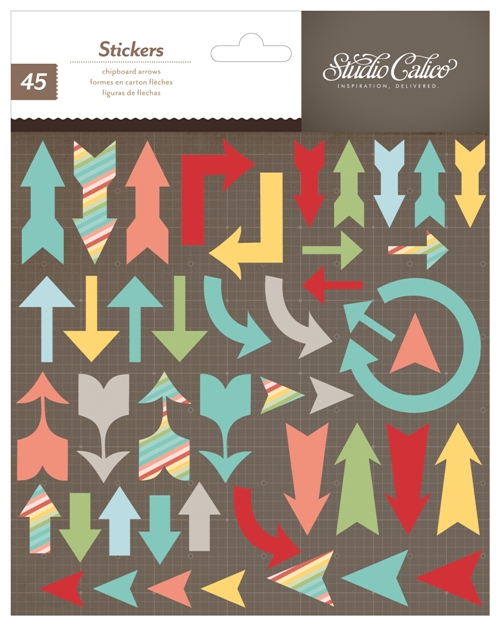 The Snippets Collection by Studio Calico has some great graphic chevron-arrow patterned papers and wood veneers. It also includes these fantastic arrow stickers, in nice bright colours - I like the mix of shapes and sizes! Look out for Snippets arriving soon.